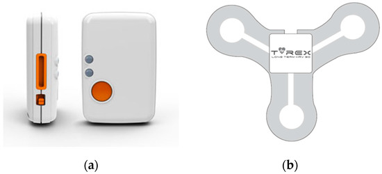 Sensors used in this study: (a) Shimmer3. This picture was obtained from its official website (http://www.shimmersensing.com/); (b) T-REX TR100A attached on a patch-type electrode. This picture was obtained from its official manual.