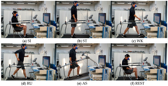 Thirteen subjects (9 males and 4 females, mean ± standard deviation age, 25.7 ± 3.1 years) were recruited for this study. Subjects were asked to fast and avoid caffeine-containing beverages and nicotine for 4 h prior to the experimental tasks. They were also asked to abstain from alcohol and vigorous exercise 24 h prior to each experiment [30]. Each participant was required to perform five basic ambulatory activities—sitting (abbreviated as SI), standing (ST), walking (WK), running (RU), ascending (AS)—and rest (REST). During SI and ST activities, no specific hand movements or position guidelines were proposed, and in the case of dynamic activities, the subjects’ natural arm motion was induced. All activities were performed on the treadmill in the experimental room, as shown in Figure 3. Static activities were performed during 5 min, and dynamic activities were performed during 10 min. As also shown in the Figure, a participant was asked to wear IMU sensors on both his/her arms, attach an ECG sensor to his/her chest, and wear a face mask to measure metabolism during a task. Activity recognition was evaluated for these five activities, and energy expenditure estimation is performed for all activities, including rest, i.e., six activities. Activity during rest looks the same as that during SI but needs to be separately considered. Because rest is sitting right after performing a dynamic activity, the physiological states of these two activities are obviously different.