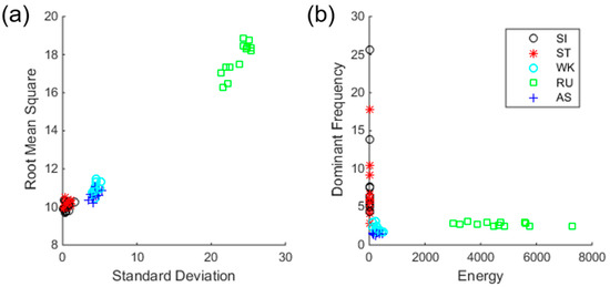 In this recognition scenario, we used four-dimensional input data, and features were extracted from IMU data only. Figure 4 shows average feature values for each subject in time- and frequency-domains, respectively. As shown in the figure, static (SI and ST) and dynamic activities (WK, AS, and RU) are clearly distinguished. However, SI and ST of static activity, WK and AS of dynamic activity are somewhat overlapping, suggesting the difficulty of classification.