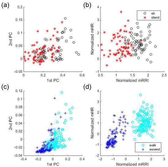 We used a statistical test to select better ECG features to solve the drawbacks observed by previous scenarios. The Mann-Whitney U test was used for the evaluation of all univariate differences in HRV parameters between the SI and ST classes, and between the WK and AS classes. To observe the effect of feature selection, we drew two scatter plots before and after feature selection using training samples with their known labels. Samples before feature selection have 31 dimensions and thus cannot be drawn in 2-D or 3-D, so we apply principal component analysis to reduce their dimensions only for the purpose of drawing the plots. Samples after feature selection are represented by two-dimensional vectors because the highest validation accuracy is obtained when two ECG features are used. Specifically, selected features are exactly the same for every 13 folds, mean R-R interval (mRRI) and mean heart rate (mHR). Figure 5 shows the effect of feature selection, separately drawn for two class-pairs, i.e., SI/ST and WK/AS. For samples before selection, the first and second principal components were used for a scatter plot. As shown in the Figure, samples before selection overlap one another, which implies difficulty in classification. However, samples with selected features show better distinctiveness compared to the samples before selection. Moreover, sample distributions before selection in classes SI and ST are more overlapped compared to those in classes WK and AS (see Figure 5a,c). This trend indicates that classification of SI and ST is more difficult than that of WK and AS, which is in line with the confusion table given in Table 3. As shown in the confusion table in Table 4, there are significant improvements in classes SI, ST, and WK, compared to the confusion table in Table 3.