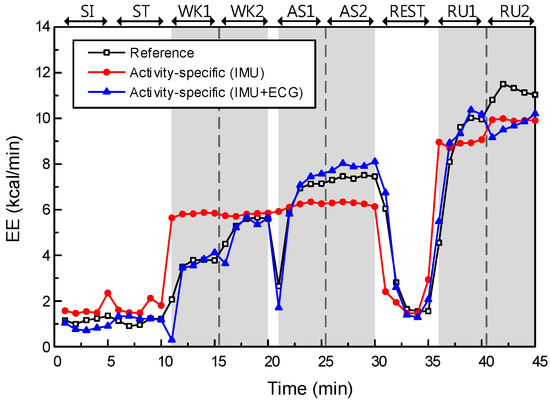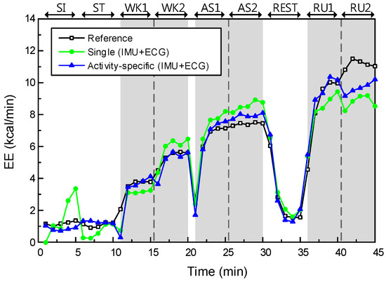 However, as reported in [21], accelerometer-based EE estimation is not yet a perfect replacement for DLW-based techniques. To improve the performance of EE estimation using an accelerometer, some studies suggested activity-specific models [6,25]. This approach may provide better performance, but users must submit their data for every activity to develop each model. Instead, we will compare single and activity-specific models with an additional ECG sensor capturing physical changes in the human body. Considering the differences in physiological changes during static and dynamic activities [7], we assume two separate models for static and dynamic activities (we call this approach activity-specific), which may help to achieve better estimation.