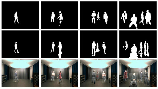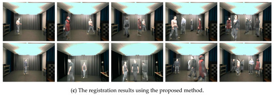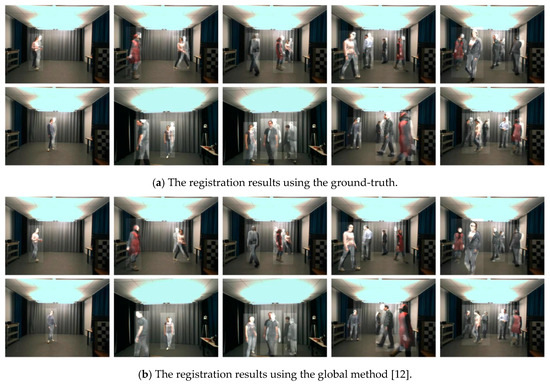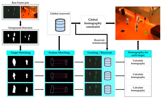 In recent years, foreground detection has been adopted to improve the precision in feature extraction. Here, some methods adopt tracking to take advantage of detected foregrounds [22,23,24]. They extract the trajectories of all targets, and then use these trajectories to estimate a frame-wide homography for the whole scene. Other approaches directly find features on the contours of foregrounds [10,11,12]. A reservoir is then applied to save matches from different frames. The reservoir may be updated by different strategies, such as First in, First out (FIFO) [10] or voting based on a RANSAC algorithm [12]. These methods also find only one frame-wide homography. Actually, these kinds of methods are proposed to align planar or near-planar scenes. Nevertheless, a matrix is insufficient to align multiple targets on different depth planes (but it is enough for one target, even if the movement of the target is non-planar). As a result, they are not suitable for non-planar scene registration. The work in [11] present the idea of considering each target individually, but it does not introduce the approach of matching targets in a complex scene, and still computes only a homography for all targets.