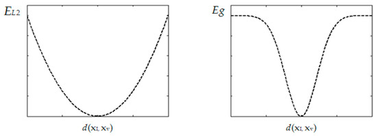 where and are the infrared and the visible feature points in the match, respectively. is the distance of the point pair transformed by the current matrix , and represents the descriptor similarity calculated by Equation (1). represents a range parameter, and is a balanced factor which controls the trade-off between spatial and attribute distances of the match. With the Gaussian criterion, we can together consider the matching metric and the homography adaptability of the match. When the reservoir is filled, the K-means algorithm [29] is used to divide all matches into two groups (inliers and outliers) according to their Gaussian distances. For a new match, we will randomly pick one of the outliers and replace it. To show the robustness of Gaussian distance, Figure 2 shows the curves of distance () and Gaussian distance (). We see that using the Gaussian distance makes inlier and outlier division become more easy.