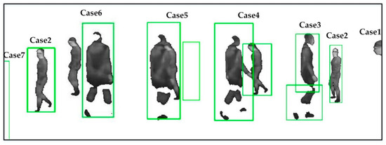 Representative cases (Case: 1–7) of tracking results for the targets with different moving states. The green bounding box shows the output of a tracker. There are seven kinds of moving state, as shown in Case (1–7): entering (Case 1), tracking normally (Case 2), fragmentation (Case 3), occlusion (Case 4), invisible (Case 5), lost tracking (Case 6) and leaving (Case 7).