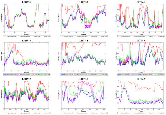 where is the transformation matrix of the kth infrared target , and is the union set of all transformed infrared targets. represents the raw visible foreground image. The error function can measure the alignment of each target for all methods. To be clear, for a frame pair, if there is no target in infrared or visible image, the overlap error of this pair is not considered.