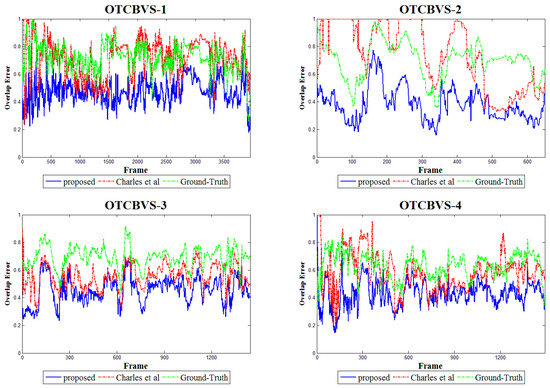 Accuracy comparisons of the ground-truth, the method of [12] and our framework using the foreground overlap errors on the OTCBVS dataset.
