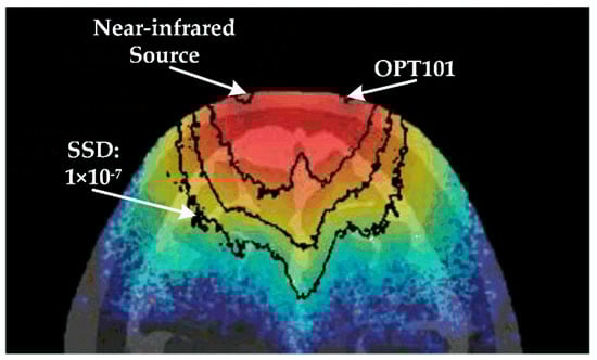 38] head model. The SSD map was shown in a pseudo color map with quantitative contours. The SSD data demonstrate that the separation scale of the light sources and detectors approved the detectable depth within tissue to be more than 3 cm, when the signal to noise ratio was higher than the limit of the OPT101 sensor, which is 1 × 10