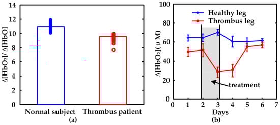 We collected data from nine patients with thrombosis during and after therapy and from seven healthy subjects for contrast. We analyzed these data and drew the scatterplot histograms of ∆[HbO2]/∆[Hb] for statistical comparisons between both populations. Thrombolytic therapy was taken on patients every other day. We also used our device to collect ∆[HbO2] from one day before and during the treatment days to analyze the therapeutic effects between thrombus and healthy legs.