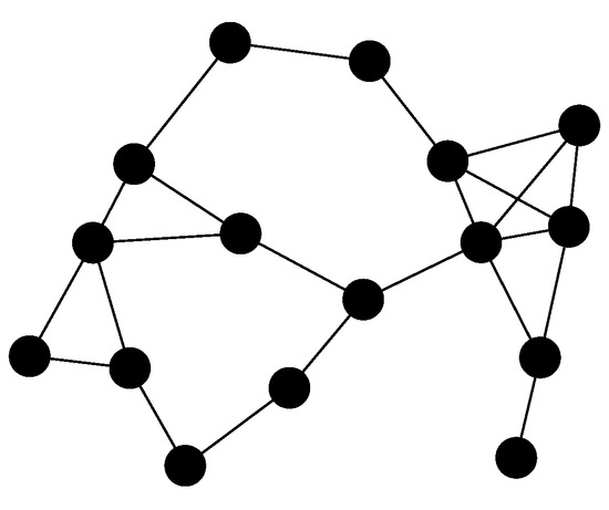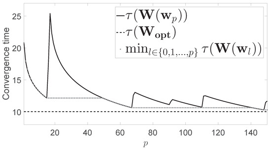 Figure 1 shows the convergence time for the network presented in Figure 2 (solid line). Figure 1 also shows , which was obtained by using CVX, a package for specifying and solving convex programs in a centralized way [16,17] (dashed line). Finally, Figure 1 also shows the minimum value of obtained up to step p (dotted line). For comparison purposes, we observe that the convergence time yielded by the Metropolis-Hastings algorithm was , while the minimum convergence time obtained after 150 iterations of our algorithm was .