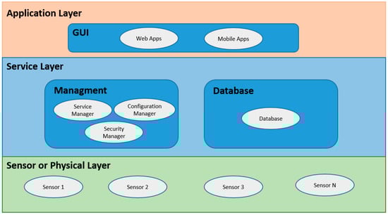 By performing an analysis of the architectures used in the different implementations, these can be illustrated in Figure 5. In general, three layers are managed within the architecture: physical layer, service layer, and application layer. The physical layer contains the sensors, which perform the readings of the different variables of interest. The service layer can be divided into two sections: the database section and the administration section. The database section contains the management of the database of the system, and the administration section contains the management of the services necessary for the proposed application to work, these can be data processing, web services, security mechanisms, etc. The application layer contains the necessary applications to display the information by the interested user, whether patient or doctor. These can be desktop applications, web applications, or mobile applications.