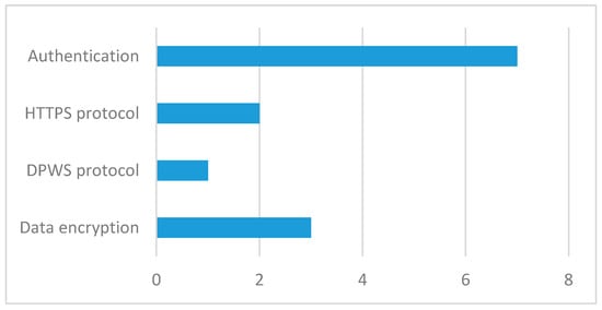 Finally, Figure 6 shows the mechanisms used to strengthen security in the revised applications. The most popular of these mechanisms is authentication with seven occurrences. It is important to note that this method is the most popular in recent years (Table 5).