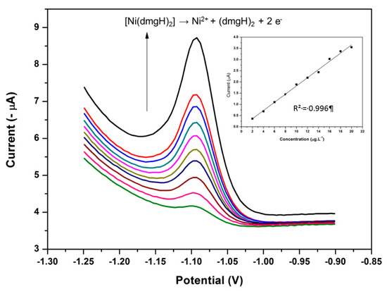 - González, P.; Cortínez, V.A.; Fontán, C.A. Determination of nickel by anodic adsorptive stripping voltammetry with a cation exchanger-modified carbon paste electrode. Talanta 2002, 58, 679–690. [Google Scholar] [CrossRef]