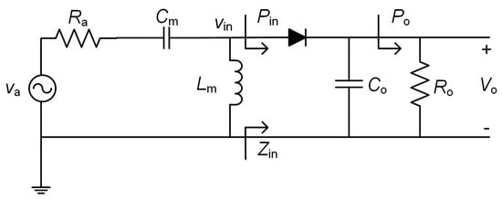 In order to achieve a high value of ηin (ideally 1), Zin has to be matched to Ra. On the other hand, from Equation (4), lower values of Vγ and higher values of Vinp lead to a higher value of ηo. Thus, ηo can be increased, for example, by using Schottky diodes (low Vγ) and a matching network with a high voltage gain (high Vinp). In order to illustrate how the matching network provides this gain, the circuit of Figure 2 is transformed into the circuit of Figure 3, where Cin and Rin model Zin in Figure 2.
