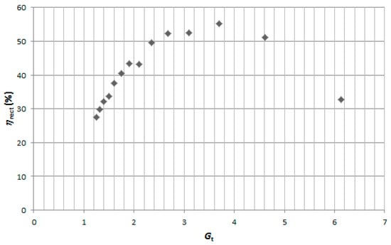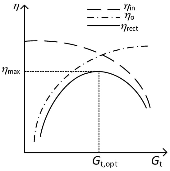 Figure 5 shows a qualitative representation of Equations (13)–(15). As can be seen, ηin decreases and ηo increases with increasing values of Gt, leading to an optimum value of Gt (Gt,opt) that provides the maximum value of ηrect (ηmax).
