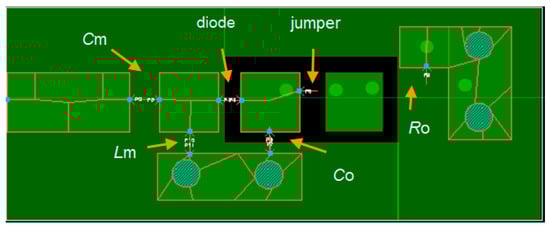 Simulations of the rectenna of Figure 2 have been carried out using the Keysight ADS software. The Harmonic Balance Analysis was used in order to compute the steady state solutions. For the diode, a Schottky HSMS-2850 device (Avago Technologies, Sant Jose, CA, USA) was selected, as it presents a low voltage drop (Vγ ≈ 0.1 V @ 0.1 mA) and a low capacitance (Cjo = 0.18 pF). Input power levels from −30 dBm to −10 dBm in steps of 5 dBm were used at a frequency of 868 MHz. Commercial components from the vendor libraries for Cm (AVX, Fountain Inn, SC, USA) and Lm (Coilcraft, Cary, IL, USA) were also used. A layout was also included in the simulations and the Momentum simulator was executed in order to obtain the related S-parameters. The physical dimensions of the printed circuit board (PCB) were 30.75 mm long and 12.10 mm width. Figure 6 shows the layout of the PCB, with indications to the placement of the components. The parameters of a Rogers substrate (RO4003C, Rogers, Chandler, AZ, USA) were selected (εr = 3.55, tanδ = 0.0021, thickness = 1.524 mm).