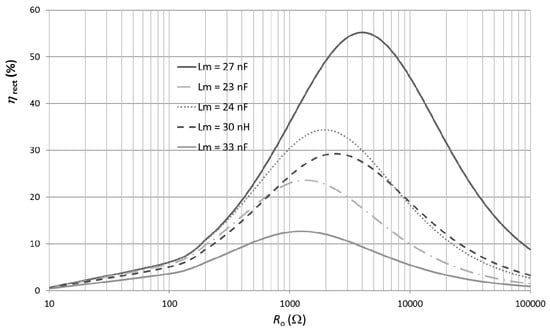 Simulation results of ηrect versus Ro for several values of Lm at Cm = 0.5 pF (Gt = 3.7) and Pav = −10 dBm.