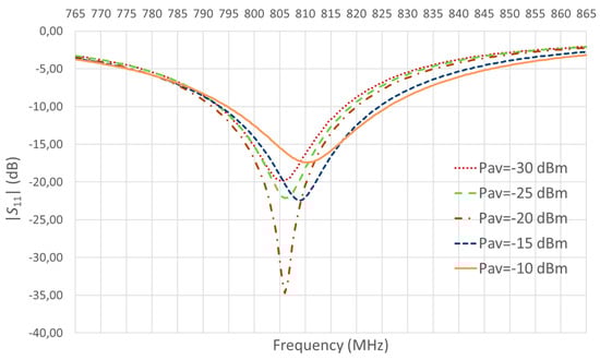 As can be seen, there is a deviation of the frequencies at which the minimum value is achieved with respect to the theoretical frequency of 868 MHz used in the simulations. This is probably due to differences between the models of the components used in the simulations and their actual values. The tolerance of the network components and deviations of the parasitic capacitances of the inductor and diode can be the main cause. In addition, the capacitance of the diode is nonlinear with the diode voltage drop and thus with vin, which accounts for the frequency shift down as the power decreases [8]. On the other hand, Table 2 shows the values of the input impedance of the rectenna at a frequency of 814 MHz, which was the value selected for the rest of tests. As can be seen, values approach the value of Ra = 50 Ω and, from Figure 9, |S11| was lower than −10 dB at that frequency for all power levels.