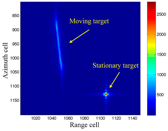 It can be seen that the azimuth localization of the moving target is different from that of the stationary target, that is, the azimuth localization imaged by DDI is pseudo-localization. This is because the Doppler rates of for them are different from each other, which has been aforementioned in the theoretical derivation. Moreover, the foundation of the Doppler rate estimation by this pseudo-localization has also been well founded.