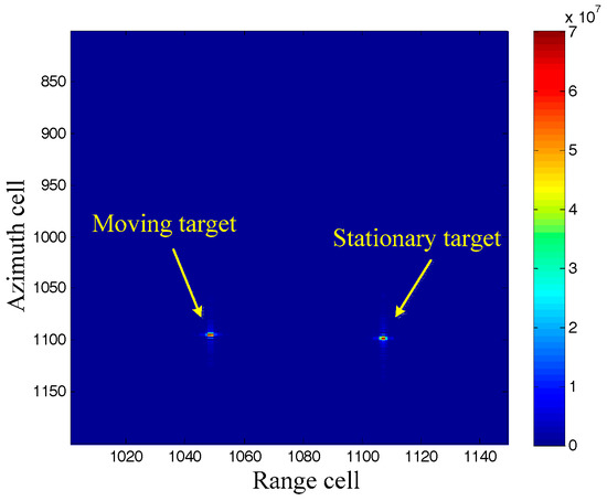 In order to present the advantages of the DDI, we compare the moving targets imaging between the RDA and the DDI in this subsection. A moving target and a stationary target, with the same azimuth localization , are imaged by both the RDA and the DDI. The RDA is realized by using the Doppler rate of the stationary target, which can be easily obtained by the system parameters. The imaging results are shown in Figure 1 and Figure 2.