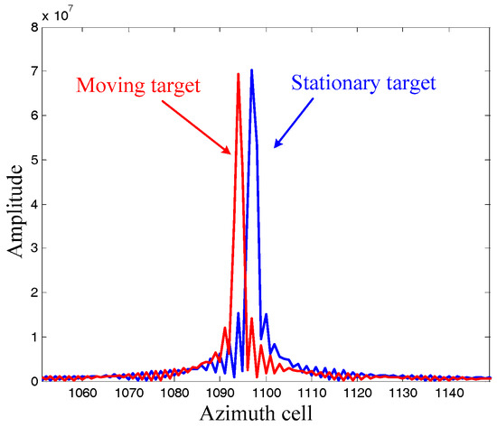 It can be seen from Figure 1 that the stationary target is well focused, while the moving target is badly defocused because of its different Doppler rate. Moreover, the imaging moving target is displaced from its original azimuth localization due to its radial velocity. We will now pay attention to the imaging results by the DDI in Figure 2. Firstly, both of the moving target and the stationary target are focused well, demonstrating that the DDI method can realize focused imaging results with an unknown Doppler rate. Secondly, the amplitudes of the targets imaged by the DDI are much higher than that by the RDA. This is because the DDI enhances the amplitude by the interferometry according to (12), which is very useful for improving the signal to noise ratio (SNR) in practical applications. Thirdly, the azimuth localization of the moving target imaged by the DDI is also displaced from its original localization. The azimuth localization comparison between the moving target and the stationary target, with the same original azimuth localization, is shown as Figure 3.