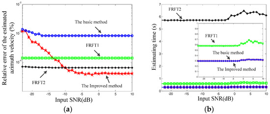 In this subsection, the Doppler rate estimation accuracy versus to the SNR of the echo is simulated. The proposed basic method, the improved method and the conventional fractional Fourier transform (FRFT) are compared to estimate the Doppler rate, with the comparison results shown in Figure 4. It is known that the FRFT can be used to estimate the Doppler rate by searching any possible values, but the estimation accuracy and computational complexity should be a trade-off due to the searching step size. In order to show these properties of the conventional FRFT, we adopt two FRFTs with different searching step sizes: method 1 (FRFT1) with a searching step size of the FRFT order as 0.5, and; method 2 (FRFT2) with a step size of 0.05.