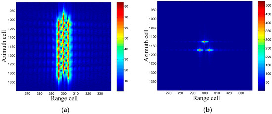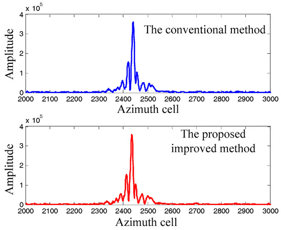 Let us take the moving target A as an example. The proposed improved method and the conventional method are used to estimate the Doppler rate, with the estimation results of and , respectively. The Doppler rate estimation results are used to reimage the moving target A by the RDA, and the imaging results are compared in Figure 8. It can be seen that the imaging results are similar to each other, which concludes that the proposed method is effective in the real scenarios.