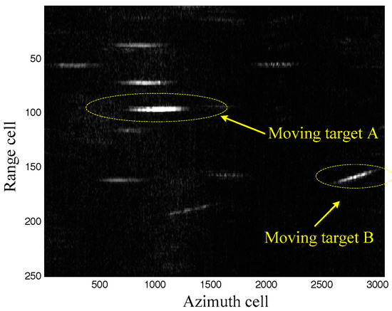 Real data is processed to further demonstrate the effectiveness of the proposed method. The system parameters are listed in Table 1. The clutter suppression result by the extended factored approach [32,33,34] in the range-Doppler domain is shown as Figure 6. The moving targets are easy to detect. Moreover, the range walk due to the radial velocity of the moving targets appears in Figure 6, which should be corrected to guarantee the moving targets imaging. As aforementioned, the keystone transform is used to realize the range walk correction, with the results shown in Figure 7. It can be seen that the range walk is effectively corrected for moving target A, while the same consequence does not occur for moving target B. This is because the used keystone transform is valid for the targets with the unambiguous radial velocities but invalid for those with ambiguous radial velocities (for example, moving target B).