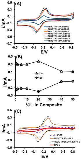 (A) Cyclic voltammograms of PEDOT:PSS/IL/SPCE prepared with different amounts of ionic liquid (IL) (1.0, 2.0, 5.0, 10.0, 20.0, 40.0, and 50%) in PEDOT:PSS/IL composite; (B) Plot of anodic (Ipa) and cathodic (Ipc) peak currents for [Fe(CN)6]3−/[Fe(CN)6]4− vs. amount of IL (%) in PEDOT:PSS/IL composite; (C) cyclic voltammetries (CVs) of SPCE, IL/SPCE, PEDOT:PSS/SPCE and PEDOT:PSS/20%IL/SPCE. All CVs were recorded in 5.0 mM hexacyanoferrate ([Fe(CN)6]3−/[Fe(CN)6]4−) in phosphate buffered saline (PBS) (pH 7.4) containing 0.1 M KCl.
