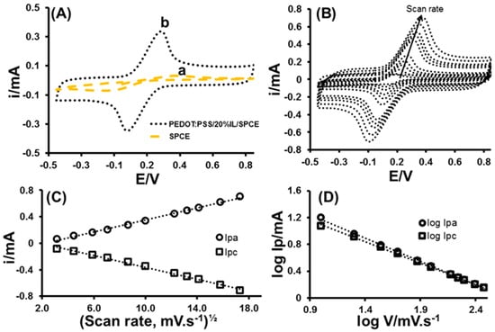 (A) Cyclic voltammograms recorded using SPCE (curve a) and PEDOT:PSS/20%IL/SPCE sensor (curve b) at 100 mV·s−1 scan rate; (B) CVs recorded using PEDOT:PSS/20%IL/SPCE sensor at 10, 20, 35, 50, 75, 100, 150, 175, 200, 250, and 300 mV·s−1 scan rates; (C) Peak current vs. square root of scan rate; (D) log Ip vs. log V. All CVs were recorded in 5.0 mM hexacyanoferrate ([Fe(CN)6]3−/[Fe(CN)6]4−) in PBS (pH 7.4) containing 0.1 M KCl.
