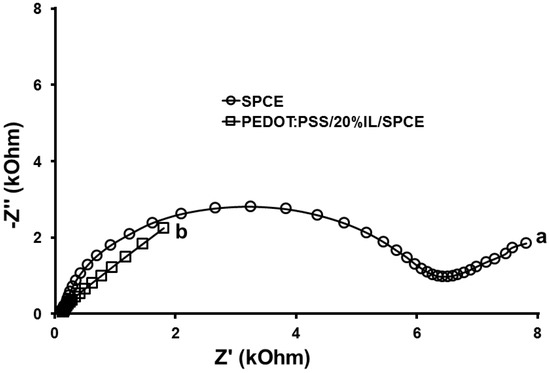 The interface properties of the bare SPCE and PEDOT:PSS/20%IL/SPCE sensor were further characterized by Faradaic electrochemical impedance spectroscopy (EIS) in the presence of 5.0 mM hexacyanoferrate [Fe(CN)6]3−/[Fe(CN)6]4− (Figure 3). The impedance spectrum associated with the bare SPCE (curve a, Figure 3) consists of a semicircle part in the high frequency region and a linear part in the low frequency region, corresponding to electron transfer and diffusion processes, respectively. The diameter of the semicircle represents the charge-transfer resistance (RCT) at the surface of the electrode [27]. At the bare SPCE (curve a, Figure 3), a semicircle with a larger diameter was obtained. However, on the PEDOT:PSS/20%IL/SPCE sensor (curve b, Figure 3), the diameter of the semicircle was negligible. This significant change in RCT value is attributed to the enhanced charge-transfer rate across the modified interface and the large surface area provided by the PEDOT:PSS/IL composite. This impedance results agree with the results obtained from the cyclic voltammetric measurements; thus, confirming the successful modification of the SPCE.