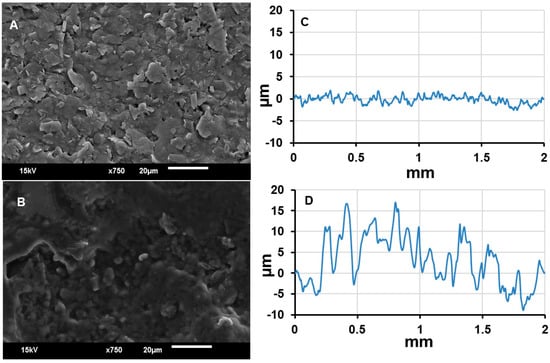 (A,B) scanning electron microscopy (SEM) images of SPCE and PEDOT:PSS/20%IL/SPCE sensor and (C,D) their corresponding surface roughness obtained from profilometry.
