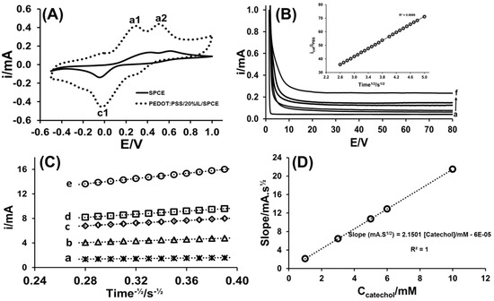 (A) Cyclic voltammograms recorded using the bare SPCE and PEDOT:PSS/20%IL/SPCE sensor in 5.0 mM catechol solution in PBS (pH 7.4) at a scan rate of 100 mV·s−1; (B) Chronoamperograms obtained at PEDOT:PSS/20%IL/SPCE sensor in the presence of (a) 0; (b) 1.0; (c) 3.0; (d) 5.0; (e) 6.0; and (f) 10.0 mM catechol in PBS (pH 7.4). Insert; icat/iPBS vs. t½ plot derived from chronoamperomeric data for PBS (a) and 1.0 mM catechol (b); (C) Linear segments of plot i vs. t−½ for (a) 1.0; (b) 2.0; (c) 5.0; (d) 6.0; and (e) 10.0 mM catechol and; (D) plot of the slopes from graph C vs. concentration of catechol.