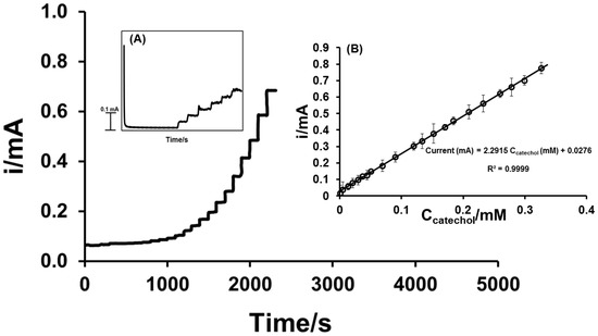 The amperometric response of catechol in PBS (pH 7.4) was measured on the PEDOT:PSS/20%IL/SPCE sensor at constant potential of 0.5 V, which was the oxidation potential of catechol (a2) (Figure 6). As shown in Figure 6 and the insert 6A, the amperometric current vs. time (i-t) curve of catechol showed that the PEDOT:PSS/20%IL/SPCE sensor had a rapid response to varying concentrations of catechol in stirred buffer solution. The establishment of well-defined steady-state current responses to standard additions of catechol indicates that the sensor is sensitive. A linear range was recorded from 0.1 µM to 330.0 µM (Figure 6B) with a sensitivity of 18.2 mA·mM·cm−2 and a calculated limit of detection (based on 3× the baseline noise) of 23.7 µM; these analytical performance characteristics are considered to be satisfactory for routine analysis of catechol in natural water samples [32,33].