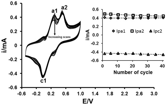 Repetitive cyclic voltammograms (40 scans) recorded at PEDOT:PSS/20%IL/SPCE sensor; insert is peak current vs. cycle number. Voltammograms were recorded in 5.0 mM catechol in PBS (pH 7.4) containing 0.1 M KCl and at a scan rate of 100 mV·s−1.