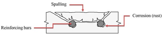 Concrete deterioration such as cracking, delamination, and spalling is often the result of a combination of factors such as corrosion of embedded metals, accumulative effect of freeze-thaw successive cycles, chemical attack, alkali-aggregate reactivity, or cracking due to shrinkage [1]. On the other hand, abrasion or overloading on bridge decks and highway pavements due to traffic operations can lead to cracking on the structure’s surface. Of these factors, the corrosion of embedded reinforcing steel in a concrete structure is the most common factor [2]. As a result, delaminations are initially developed at or near the level of the reinforcing bars because rust occupies a greater volume than steel, creating unexpected tensile stresses in the concrete [1,3]. Cracking and delaminations might be invisible upon visual inspection until the deterioration develops into a spalling condition in its later stages, as shown in Figure 1. This raises safety concerns, especially for the traffic passing under overpass bridges.