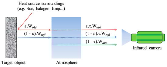 IRT is known as a technique that measures the infrared radiation emitted by an object and converts the energy detected into a temperature value [14]. Each pixel then represents a thermal spot that is shown on a display or image, the so-called thermal infrared image. However, when measuring an object, the IR camera not only receives the radiation emitted from the object, but also the radiation from other sources such as surrounding objects or the atmosphere, as illustrated in Figure 2.