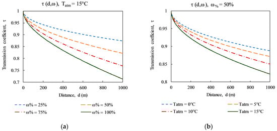 Characteristics of atmospheric transmission coefficient τ = f(d) for longwave band LW ThermaCAM PM 595 camera: (a) Function of the relative humidity ω%; (b) function of the atmospheric temperature Tatm [17].