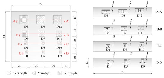 To assess the influence of environmental conditions on the subsurface delamination detection, a concrete specimen was fabricated with the design compression strength of 28 MPa. The concrete mixture ratio of water, cement, sand, and aggregate are 0.5, 1.0, 1.2, and 2.6, respectively. The thermal diffusivity (α) of the concrete specimen is estimated to be 1.636 cm2/min as described below. Twelve delaminations were simulated with different dimensions and depths embedded inside the concrete specimen. The delaminations considered in this study are square shapes of polystyrene, denoted hereafter as a capital letter “D”, with the size of 10 cm × 10 cm, 7 cm × 7 cm, 5 cm × 5 cm, and 3 cm × 3 cm at 1 cm deep (D9 to D12), 2 cm deep (D5 to D8), and 3 cm deep (D1 to D4) from the specimen's surface as shown in Figure 4. The delaminations are simulated using polystyrene, the thermal conductivity of which is 0.027 W/m·°C, which is similar to that of air (0.024 W/m·°C [21]) and is thus expected to behave in a similar manner to that of an air void when receiving heat flux [22].
