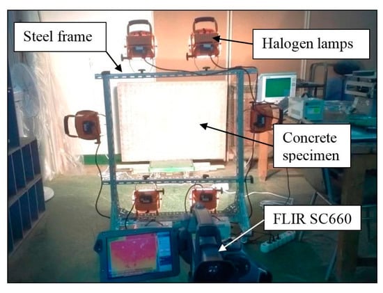 - Huh, J.; Tran, Q.H.; Lee, J.; Han, D.; Yim, S. Experimental Study on Detection of Deterioration in Concrete Using Infrared Thermography Technique. Adv. Mater. Sci. Eng. 2016, 2016, 12. [Google Scholar] [CrossRef]