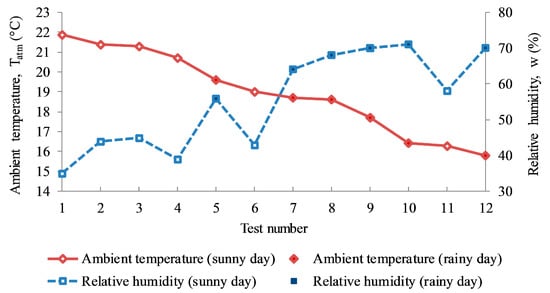 The variation in the relative humidity occurred because the saturated vapor pressure is determined by the air temperature. As the water vapor content stays the same, the temperature increases, the relative humidity decreases substantially, and as the temperature drops, the relative humidity rises substantially [24]. The same behavior was shown for the twelve test cases in this study. When sorting all ambient temperature data in descending order, the general trend of relative humidity increased correspondingly, except for some test cases which showed low values of relative humidity, such as tests number 4 and 6 as shown in Figure 6.