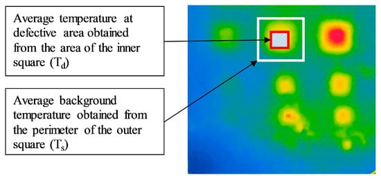 It is also important to note that absolute contrast values are significantly dependent on the method by which they are obtained. In the selection of the reference background temperature using the one- or three-point method as mentioned previously, the absolute contrast can easily vary if the reference point is moved. To deal with this problem, in this research the reference background temperature is obtained by taking the average of all pixels on the perimeter of the square around the defect; using this approach, it is expected that mistakes in selecting the background temperature can be avoided, as shown in Figure 7.