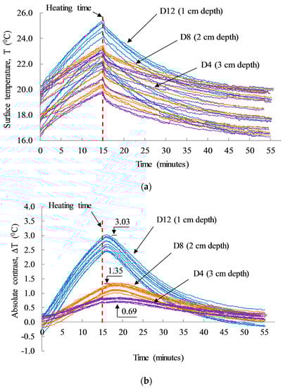 The results shown in Figure 8 illustrate the absolute contrasts obtained from delaminations D4, D8, and D12 having the same size of 10 cm × 10 cm and different depths under the twelve cases of dissimilar environmental conditions. The absolute contrast of the shallow delamination (D12) shows a higher temperature than the other delaminations. In addition, the group of twelve test cases displays different absolute contrasts for each delamination depth under varying atmospheric conditions. In particular, as the ambient temperature decreases from 21.9 °C to 15.8 °C, the absolute contrast of D12, D8, and D4 also decreased from 3.03 to 2.45, from 1.35 to 1.02, and from 0.86 to 0.69, respectively, as depicted in Figure 8b. This can be explained by considering that, when the ambient temperature decreases, the thermal gradient between the surfaces and core of the concrete also decreases. Consequently, the heat flux transferred from the heat sources (halogen lamps) to the concrete core decreased. Thus, the absolute contrast was similarly low under low ambient temperature with the same size and depth of defect, and the same heating time, type of heat source, and heat transfer energy.