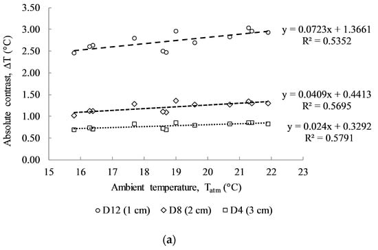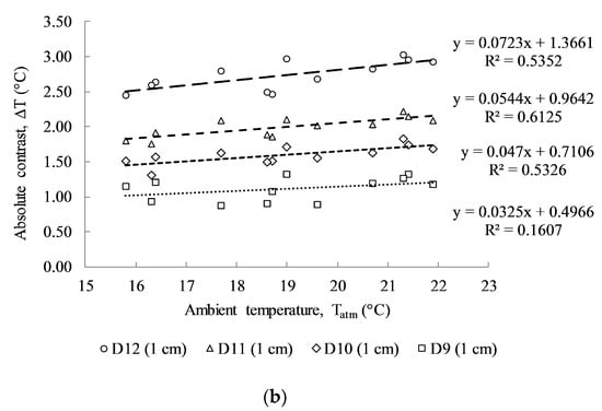 Figure 9a illustrates the linear relationship between absolute contrast and ambient temperature, in which the correlation coefficient values (R2) give relatively low values of 0.5352, 0.5695, and 0.5791 corresponding to the delamination sizes of 10 cm × 10 cm at 1 cm, 2 cm, and 3 cm, respectively. The slopes of the results of the linear equations also indicate the positive correlation between the ambient temperature and the absolute contrast that was developed above the delaminations with different depths. Higher R2 values are obtained than those from the Washer’s field test (with R2 = 0.22). This might be due to the effects of wind speed, different solar loading, and cloud path during the test. In addition, the slope tendency of a linear line becomes steeper with shallower delamination. In particular, the slopes of linear regression lines are 0.0723, 0.0409, and 0.024 for delaminations D12, D8, and D4 at 1 cm, 2 cm and 3 cm depths, respectively.
