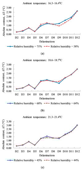 In this study, to investigate the effect of relative humidity on the active thermographic method, data coinciding with ambient temperature (0.1 °C difference) with varying relative humidity are considered. These data are divided into three groups with the average atmospheric temperatures of 16.35 °C, 18.65 °C, and 21.35 °C, along with three pairs of relative humidity (71% and 58%), (68% and 64%), and (45% and 44%), respectively. All data are plotted in Figure 10, illustrating the change of absolute contrast under similar testing conditions, though with varying humidity. The difference of absolute contrast is more clearly shown in Figure 10a than in Figure 10b,c, especially for shallower delaminations from D9 to D12. The absolute contrast values when tested with high humidity show larger values than those tested in the low humid atmosphere. This might be due to the significant relative humidity difference shown in Figure 10a of approximately 13%, compared to 4% and 1% for other two cases shown in Figure 10b,c, respectively. For deeper delaminations from D2 to D8, the change of absolute contrasts due to the influence of humidity observed from this experiment is not significant. It should be noted that this judgment is based on limited data and that uncertainties occurred in the environmental conditions during testing. It is recommended that relative humidity needs to be considered as a secondary factor in a practical point of view when using active thermography in a field application.