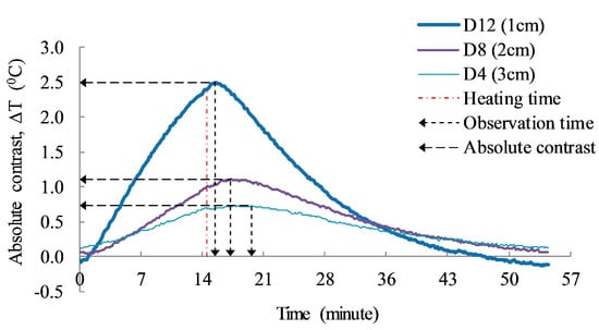 The depth of defect has been quantified through the observation time (t) shown as the vertical dashed arrows in Figure 11. It is defined as the time when the absolute contrast remains constant or increases to the maximum contrast after the heating time [5,6].