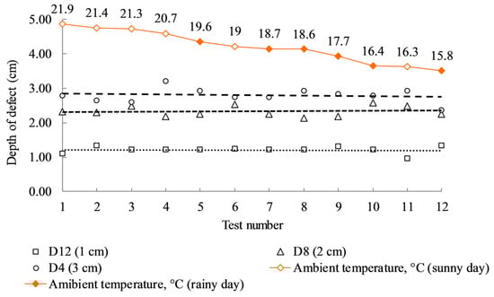 Figure 12 illustrates the estimated defective depth values for delaminations D4, D8, and D12, sorted in the descending order of ambient temperature. The result shows that the estimated depth values fluctuate with different environmental conditions, and the fluctuation is relatively high for deep defects. However, the overall trend is maintained, despite a decline of ambient temperature. It can be inferred that the depth detection might be less affected by the environmental conditions such as ambient temperature and relative humidity, especially for shallow defects.