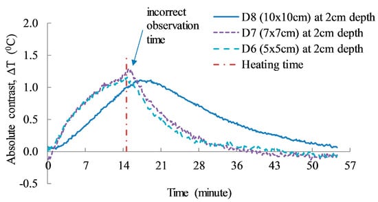 In addition, while larger delaminations are normally more expected for higher temperatures than smaller temperatures at a similar depth, delamination D7 indicates unusual behavior. Particularly, the test results shown in Figure 10 indicate that the absolute contrast of delamination D7 (7 cm × 7 cm) has a higher temperature value than that of the larger delamination, D8 (10 cm × 10 cm) at the same depth of 2 cm. This could be due to non-uniform heating on the specimen surface and/or due to the reflection of the heat from the concrete surface, as reported by Vaghefi [5]. It is also observed in this research that the existence of tiny air voids in the concrete cover above both defects of D6 and D7 are due to the low compaction when fabricating the specimen. This leads to several hotter points above the defect location that might increase the average temperature of the defective area. It is noted that the selection of a suitable defective zone plays an important role in absolute contrast analysis.