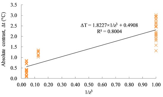 The absolute contrast values versus the invert of the cubic depth (1/z3) of each delamination are also plotted in Figure 16. Based on the figure, the relationship between the absolute contrast and the inverse of the cubic depth (1/z3) is relatively accurate with a linear correlation coefficient value (R2) of 0.8004. It should be noted that the data are limited for only three different depths, four different sizes, and twelve cases of dissimilar environmental conditions.