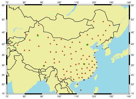 In addition to radiosonde data, this study used high-accuracy ZTD data provided by IGS to validate the reliability of all tropospheric models, and the RMS value and temporal resolution of the data were 1.0~5.0 mm and 5 min respectively []. These ZTD data are directly estimated from raw GPS range measurements employing a precise point positioning (PPP) approach [] and using the IGS Combined Final orbit and clock product. We utilized ZTD data for 2013 collected from four Chinese IGS stations to validate all tropospheric models, and these stations are BJFS, WUHN, URUM, and LHAZ shown as green solid circles in Figure 1.