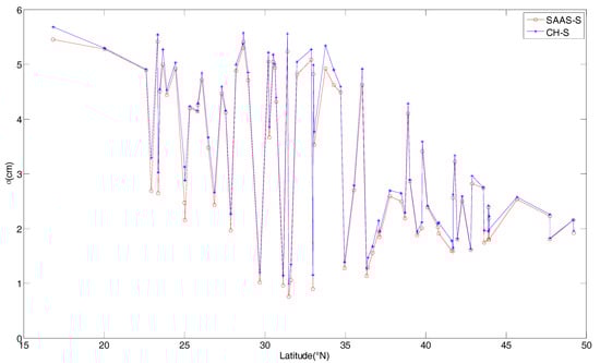 In order to analyze the fitting effect of the model coefficients, Figure 2 provides the variations of the fitting error for the two single-site tropospheric models in different latitude regions. The  of the two single-site models basically ranges from 0.75 cm to 5.68 cm, and the  values of the SAAS_S model are slightly smaller than those of the CH_S model. With the increase in latitude, the  values decrease, and the fitting errors of the single-site models gradually decrease as well.